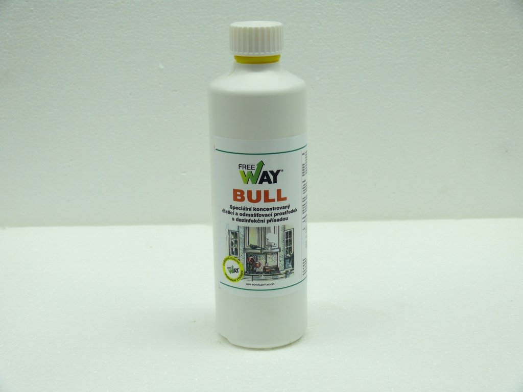 BULL-koncentrát.Odmašťovací, čistící přípravek s desinfekčním účinkem.Má silné odmašťovací účinky. Je vhodný pro kuchyňská zařízení, myčky nádobí, chladničky, vany, čistící stoje, motory, kov, gumu i umělé hmoty, odstraňuje zbytky hmyzu na karosérií